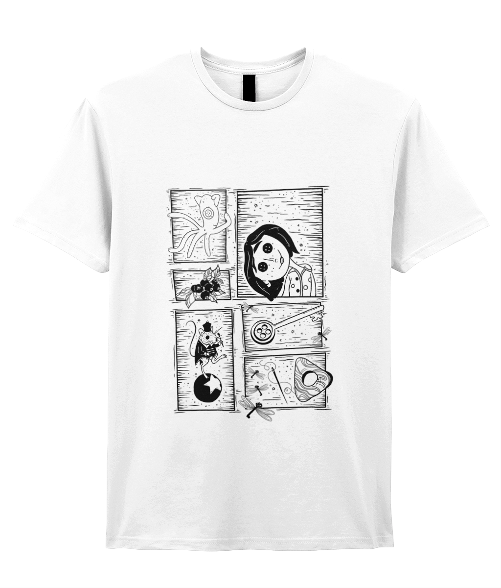 My Coraline shirt comes in six different colours! White, sand, forest green, blue, red and charcoal grey! The red, blue, green and grey shirts are great for a more subtle print design with the shirts themselves being a little darker, whilst the white and sand versions make the black print really pop! It's a super soft material and a unisex fit so suitable for everyone and available in a range of sizes. The perfect tee to wear for all of your spooky fits!